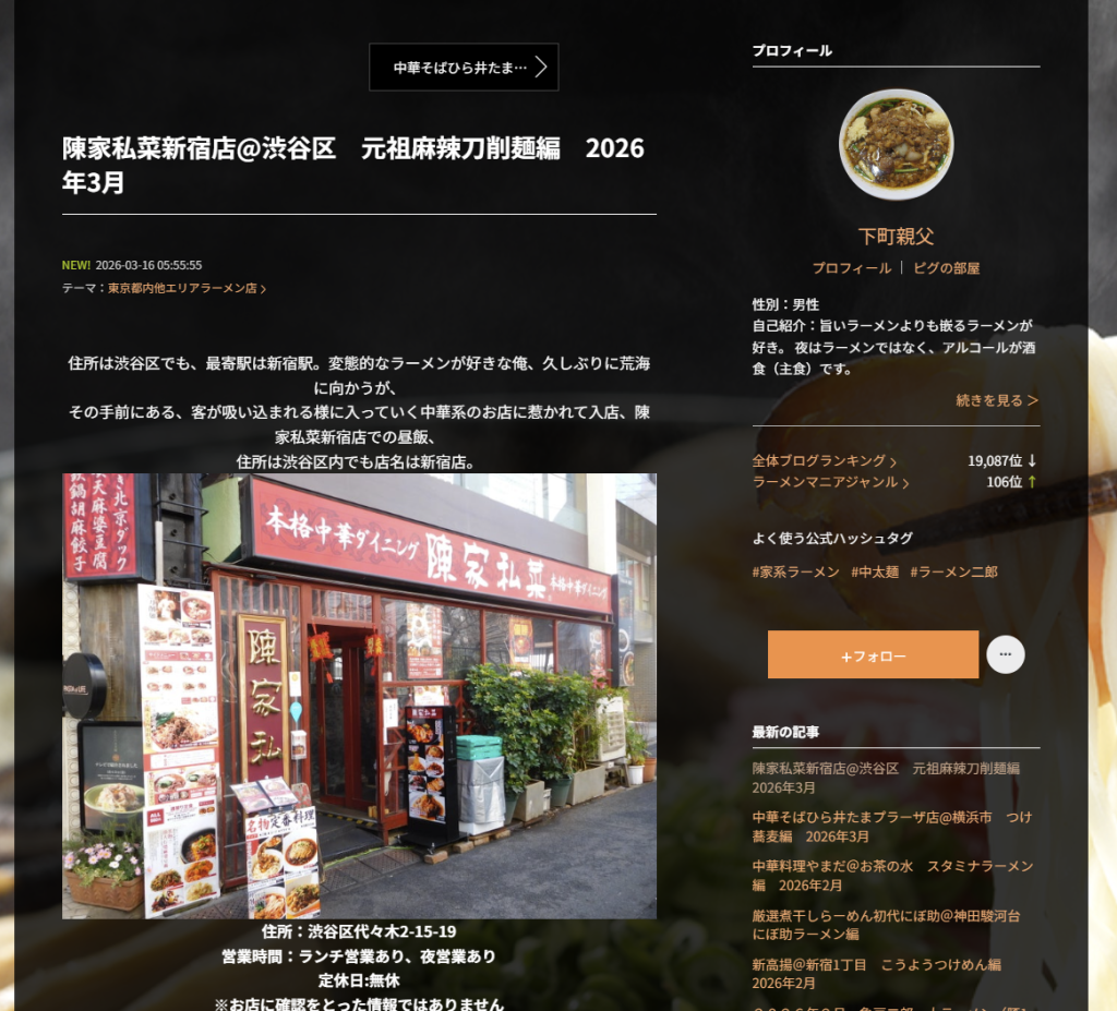 まるし様に「辛い麻婆豆腐求めて1年ぶりの訪問」と題して陳家私菜新宿店をご紹介いただきました
