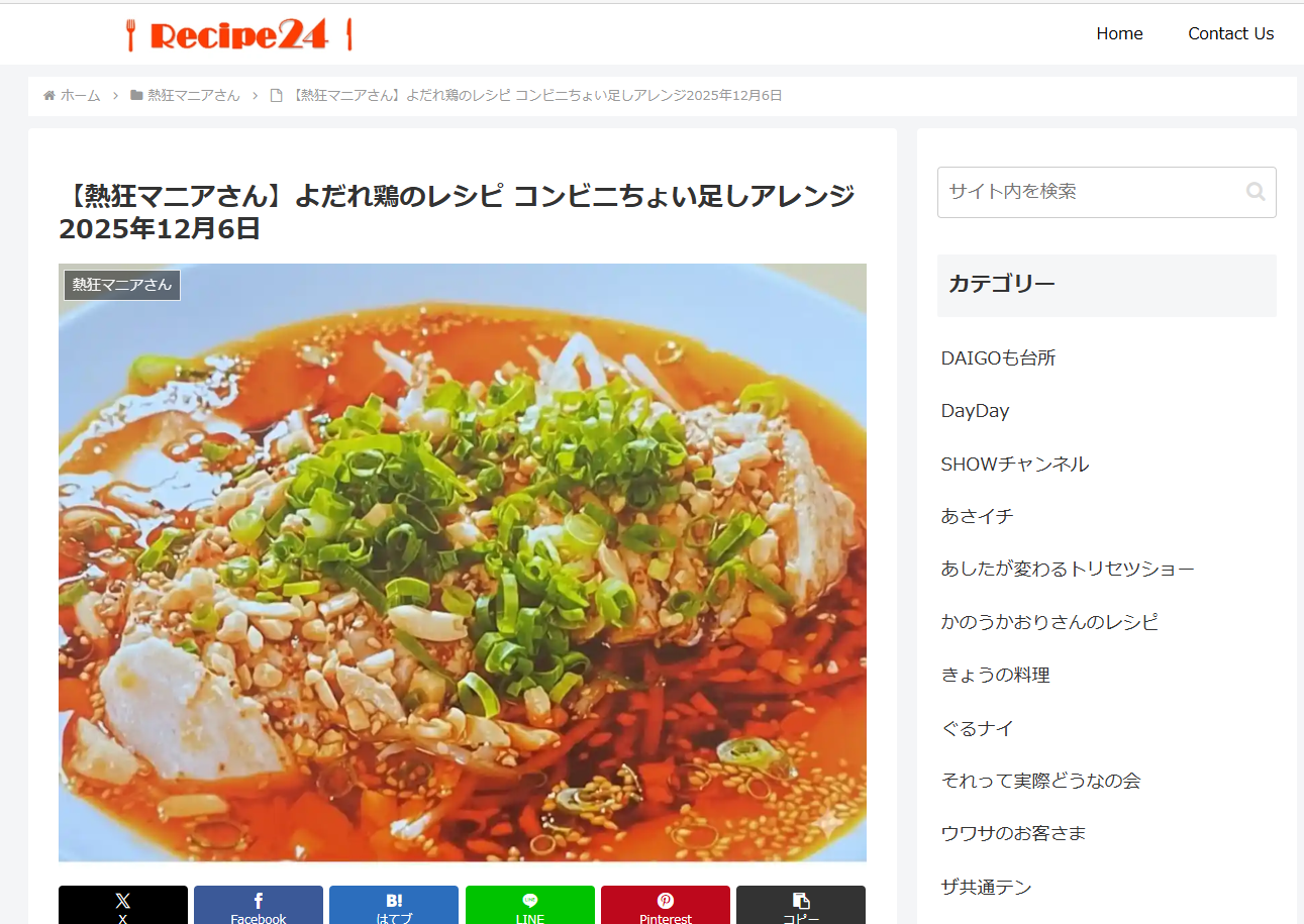 今回掲載いただいたのは、2025年12月6日(土)放送のTBS系列『熱狂マニアさん』で特集された「コンビニちょい足しアレンジレシピ」の内容をまとめた記事です。放送では、コンビニちょい足しマニアの東山さんが、セブンイレブンの商品に少しのアレンジを加えるだけで高級レストラン風の一皿を再現できるかに挑戦。当店の人気メニュー**「よだれ鶏」**を目標レシピとして取り上げていただき、ギャル曽根さんをはじめとする美食家の芸能人の皆さまを相手に、コンビニちょい足しで本物の味に迫れるかが試されました。