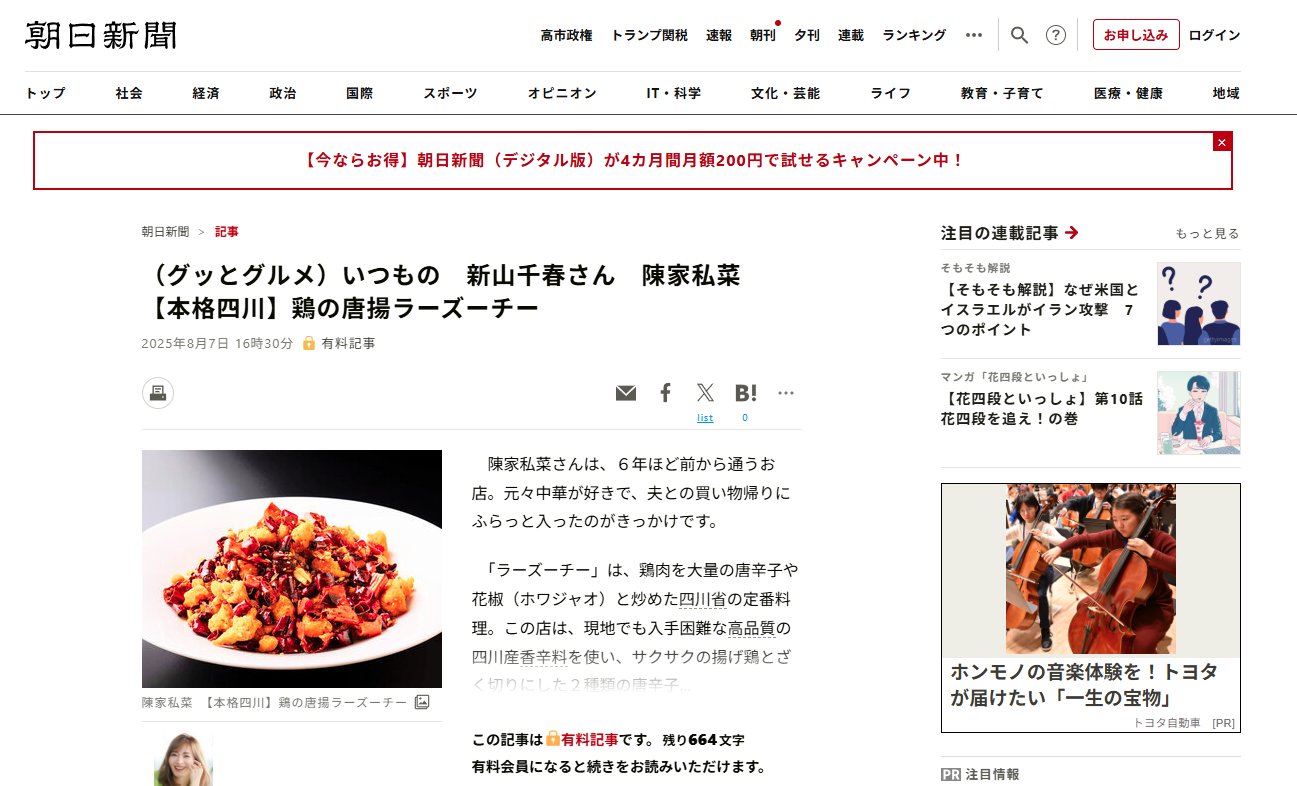 2025年8月7日付の朝日新聞(朝日新聞デジタル)にて、タレントの新山千春さんが「いつものお店」としてご紹介くださる連載コーナー「グッとグルメ」に、陳家私菜 渋谷店が掲載されました。