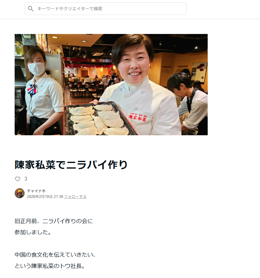 2026年2月19日にnoteにて公開された記事「陳家私菜でニラパイ作り」(チャイナホ様)において、旧正月前に開催されたニラパイ作りの会の様子を温かくご紹介いただきましたので、ここにご報告申し上げます。