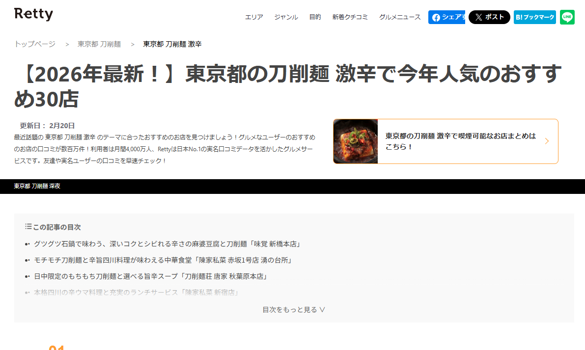 今回掲載いただいたのは、**「【2026年最新!】東京都の刀削麺 激辛で今年人気のおすすめ30店」**と題されたランキング特集です。東京都内の刀削麺・激辛グルメというテーマで、実際にご来店いただいたユーザーの皆さまの口コミをもとに選ばれた30店のなかに、陳家私菜の4店舗が選ばれました。
